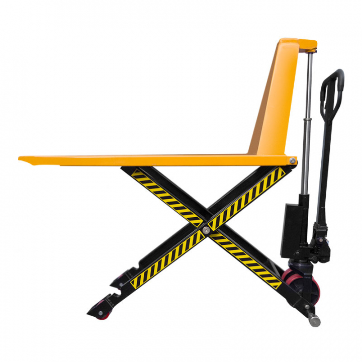 Благодаря телескопической конструкции гидроцилиндра снижены габариты и масса тележки, что значительно повышает удобство ее эксплуатации. Ручка со специальным покрытием делает управление тележкой комфортным в любое время года. При подъеме вил на высоту 400 мм на землю опускаются дополнительные опоры, препятствующие перемещению тележки и повышающие ее устойчивость.