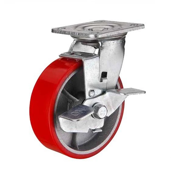 Колесная опора большегрузная поворотная с тормозом (полиуретановое покрытие, чугунный обод, в оси - роликовый подшипник)